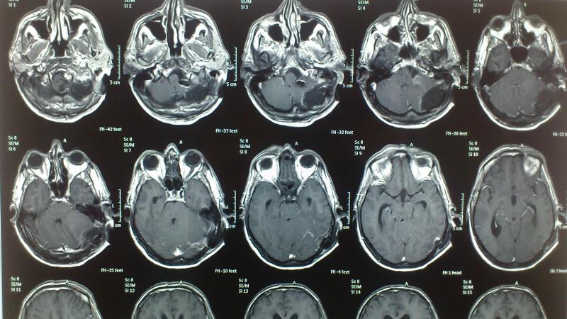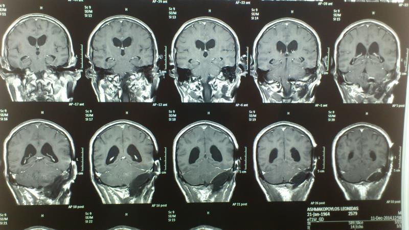 Ασθενής άνδρας 55 ετών προσήλθε λόγω αστάθειας βάδισης και πάρεσης των κατώτερων εγκεφαλικών συζυγιών ( ΙΧ,Χ,ΧΙ ). Ο έλεγχος με μαγνητική τομογραφία εγκεφάλου ανέδειξε εικόνα συμβατή με μηνιγγίωμα ινιακού τρήματος με σημαντική πίεση επί του στελέχους. Ο ασθενής υποβλήθηκε σε αριστερή Far Lateral Transcondylar προσπέλαση. Μετεγχειρητικά ο ασθενής παρουσίασε ήπια επιδείνωση της πάρεσης των κατώτερων εγκεφαλικών συζυγιών που ωστόσο αποκαταστάθηκε σταδιακά στα προεγχειρητικά επίπεδα Ο μετεγχειρητικός απεικονιστικός έλεγχος ανέδειξε ολική αφαίρεση του όγκου.