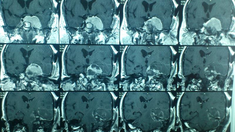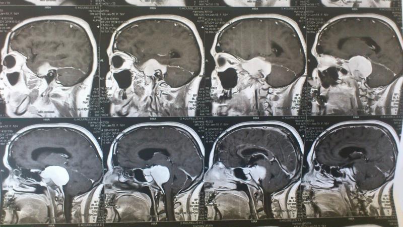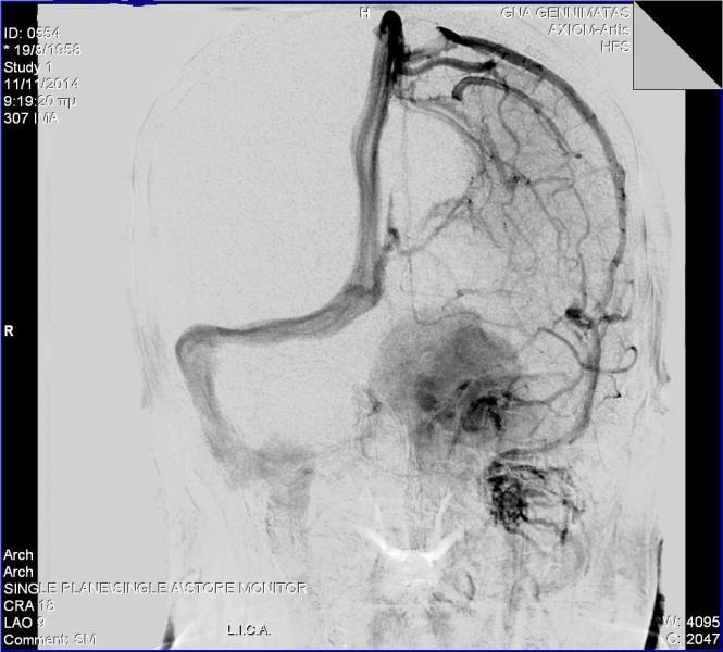 Ασθενής γυναίκα ηλικίας 56 ετών προσήλθε λόγω αστάθειας βάδισης, έκπτωσης ακουστικής οξύτητας αριστερά, αιμωδιών προσώπου κατανομής V2-V3 αριστερά και διπλωπίας ( ήπια πάρεση κοινού κινητικού ) . Ο προεγχειρητικός απεικονιστικός με μαγνητική τομογραφία εγκεφάλου ανέδειξε εικόνα συμβατή με μηνιγγίωμα αποκλίματος και λιθοειδούς ( petroclival ) , με επέκταση στο Meckel's cave και στον αριστερό σηραγγώδη κόλπο καθ' όλη την έκτασή του. Λόγω μεγάλου μεγέθους και έκτασης του μηνιγγιώματος αποφασίστηκε η αφαίρεσή του σε 2 στάδια. H προεγχειρητική αγγειογραφία ανέδειξε υπολειπόμενο τον αριστερό εγκάρσιο κόλπο με έντονο παράπλευρο δίκτυο με δυνατότητα εκτομής του (transsinus ), αποφεύγοντας τις διαλιθοειδικές προσπελάσεις και την συνοδό νοσηρότητά τους. Η ασθενής είχε ομαλή μετεγχειρητική πορεία με βελτίωση της αστάθειας βάδισης και της ακουστικής οξύτητας. Ο μετεγχειρητικός απεικονιστικός έλεγχος ανέδειξε αφαίρεση του τμήματος του όγκου στον οπίσθιο κρανιακό βόθρο.