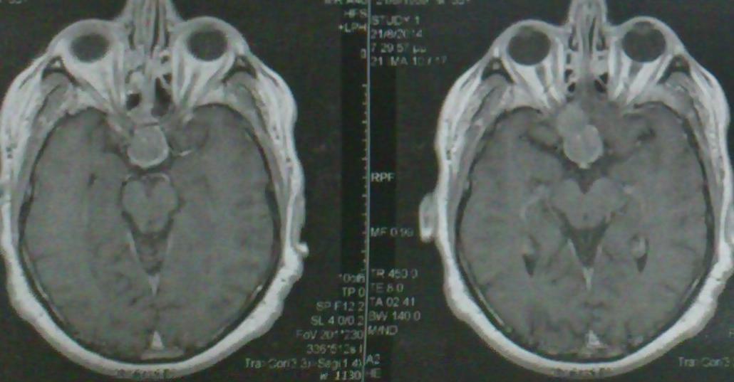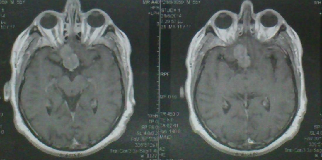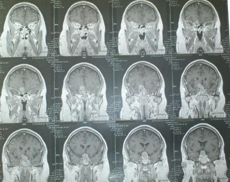 Ασθενής 55 ετών ο οποίος είχε υποβληθεί προ 3μήνου σε ενδοσκοπική διασφηνοειδική αφαίρεση μακροαδενώματος υπόφυσης ( αδύνατη λόγω σκληρής σύστασης του όγκου η αφαίρεση του υπερεφιππιακού τμήματος του όγκου) προσήλθε στην κλινική μας με σκοπό την αφαίρεση του υπερεφιππιακού τμήματος του όγκου δια υπερόφρυας τομής δέρματος και δεξιάς mini orbitozygomatic keyhole approach. Η μετεγχειρητική του πορεία ήταν ομαλή με περαιτέρω βελτίωση των οπτικών του πεδίων ( αρχική μικρή βελτίωση μετά την ενδοσκοπική διασφηνοειδική προσπέλαση ) και ο απεικονιστικός έλεγχος ανέδειξε την πλήρη αφαίρεση του υπολειμματικού όγκου.