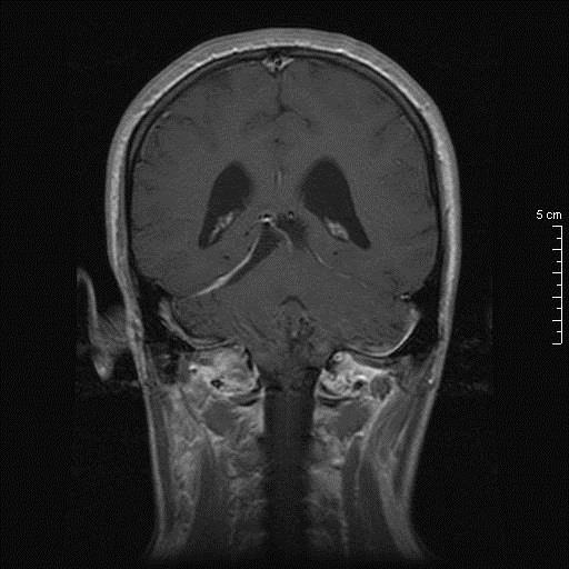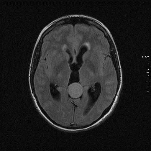 Γυναίκα 34 ετών παρουσιάστηκε με κεφαλαλγία, περιστασιακά διπλωπία και στην εξέταση οίδημα οπτικών θηλών. Η μαγνητική τομογραφία κατέδειξε βλάβη διαμέτρου 26.7 χιλ στην περιοχή της επίφυσης χωρίς ενίσχυση, με πίεση επί του τετραδύμου και σημαντική διάταση του κοιλιακού συστήματος. Σε θέση park bench υποβλήθηκε σε δεξιά πλάγια περιορισμένη ινιακή κρανιοτομία και μέσω της υποσκηνίδιας υπερπαρεγκεφαλιδικής οδού σε ενδοσκοπικά υποβοηθούμενη μακροσκοπικά πλήρη αφαίρεση της βλάβης.
